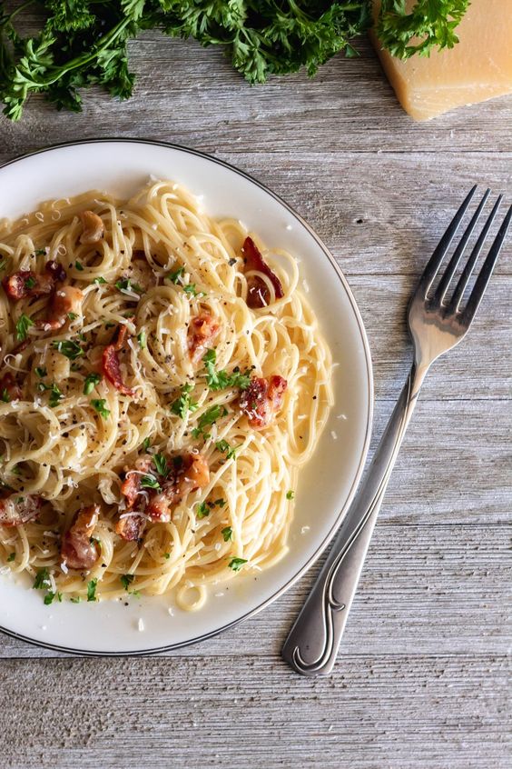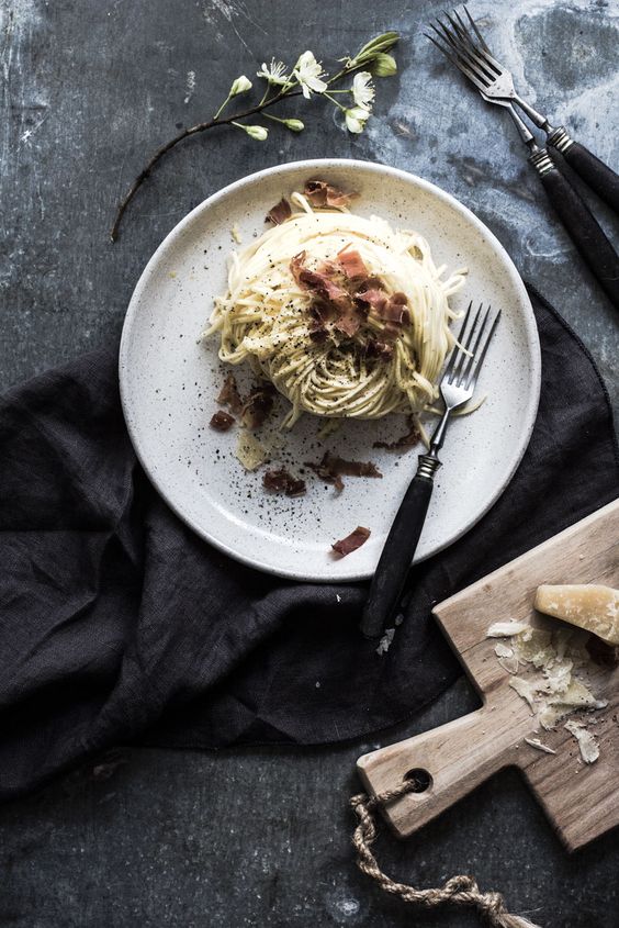 Carbonara has a creamy sauce with an egg base. The heat from the noodles cooks the eggs so it’s best of the eggs are room temperature and you have it prepared so it can be added to the hot pasta quickly!